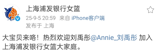 根据上海女篮官方公告,上赛季在北京首钢效力的刘禹彤正式完成了转会,她新赛季会代表上海出战WCBA。